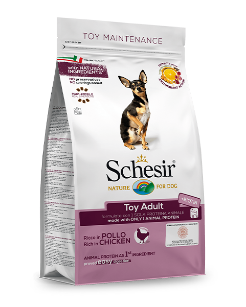 Uma receita Schesir que tem, como ingrediente principal, o frango, que representa a única fonte proteica animal da preparação: um alimento saboroso, completo e balanceado, facilmente digerível, que satisfaz as exigências nutricionais dos cães adultos toy. Ademais, a dimensão dos croquetes, em formato mini, é especificamente concebida para eles!